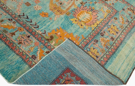 A unique and imaginative look using traditional design elements to create an energetic experience. Orange brown and beige motifs from antique designs are upscaled, reoriented and placed in a variegated field of bold turquoise. Tracings of pink and dabs of green add an element of sophistication The overall effect is one of soft artisanal modernity